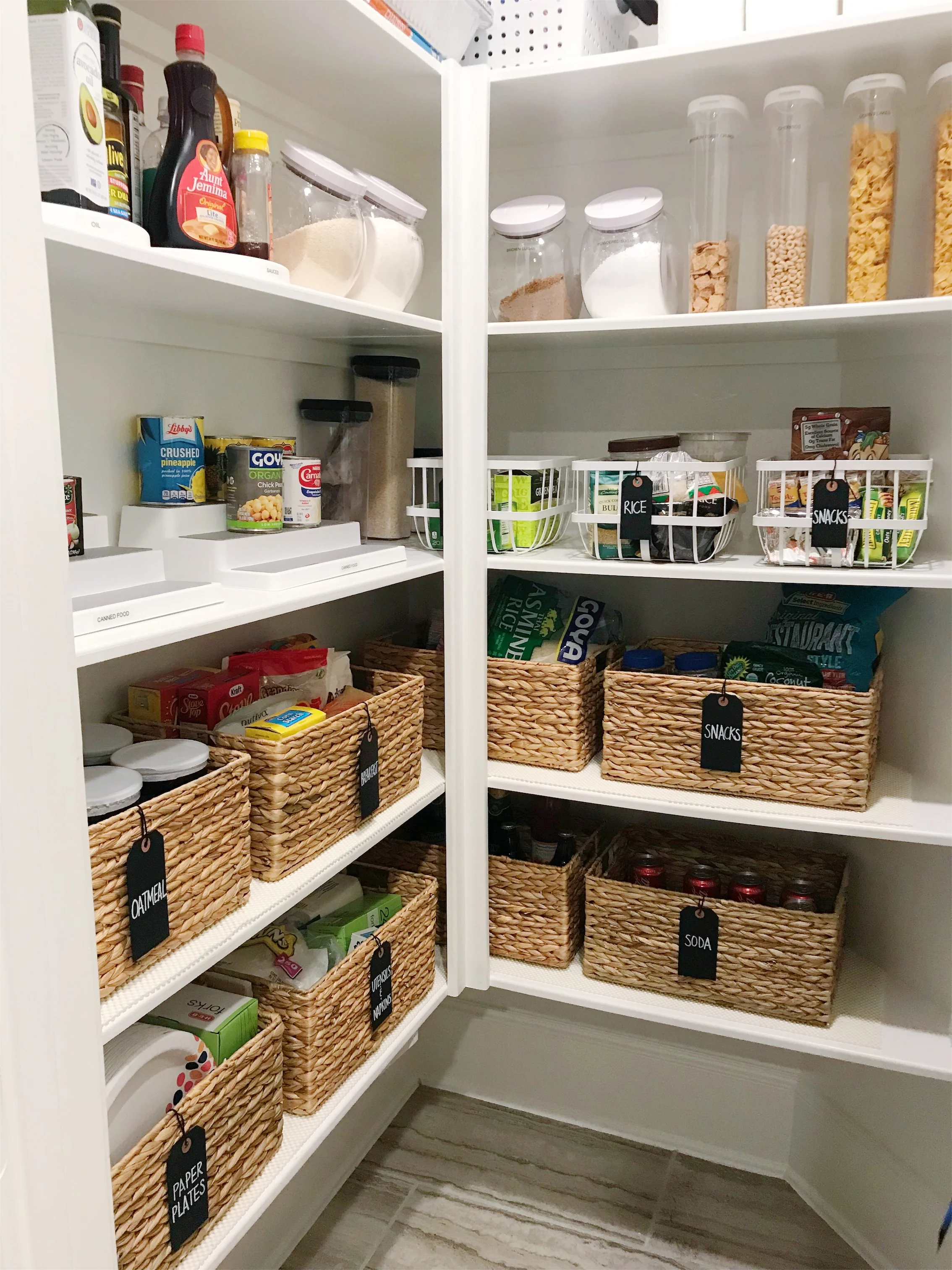 This pantry was decluttered and organized and now reveals a functional and organized space.
